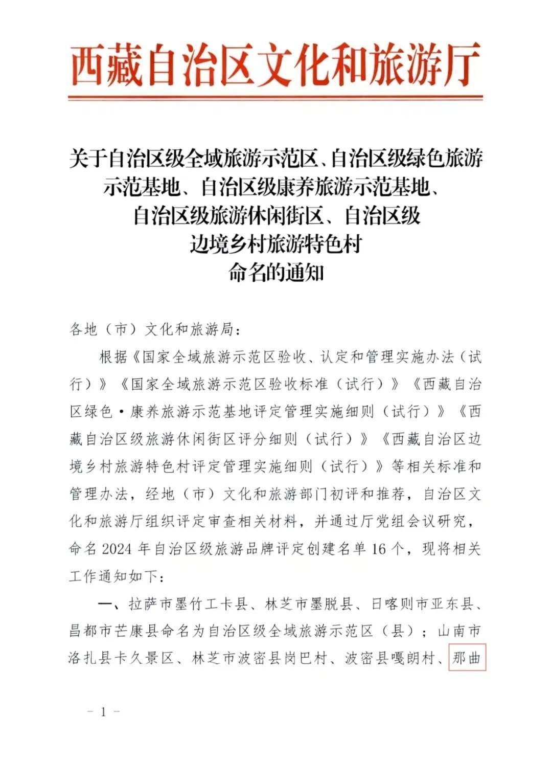 關于自治區級全域旅游示范區、自治區級邊境鄉村旅游特色村等命名的通知
