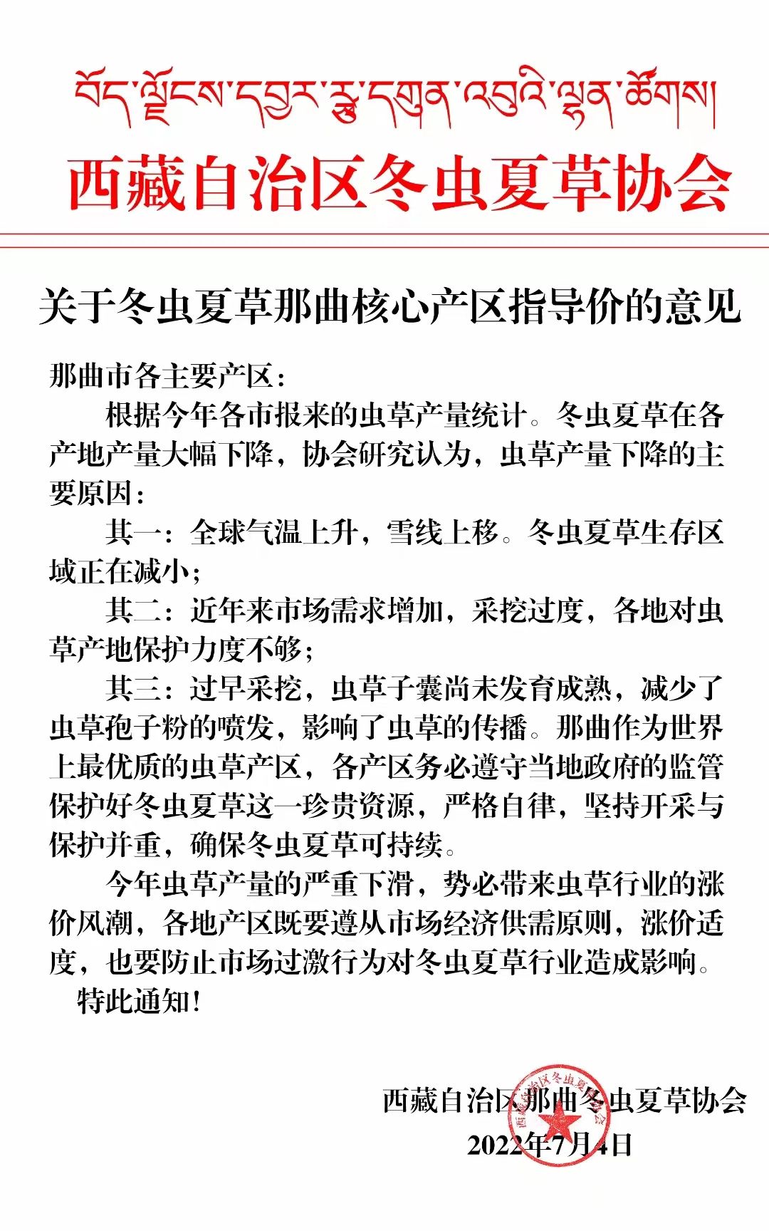 西藏自治區(qū)冬蟲夏草協(xié)會(huì) 關(guān)于冬蟲夏草那曲核心產(chǎn)區(qū)指導(dǎo)價(jià)的意見