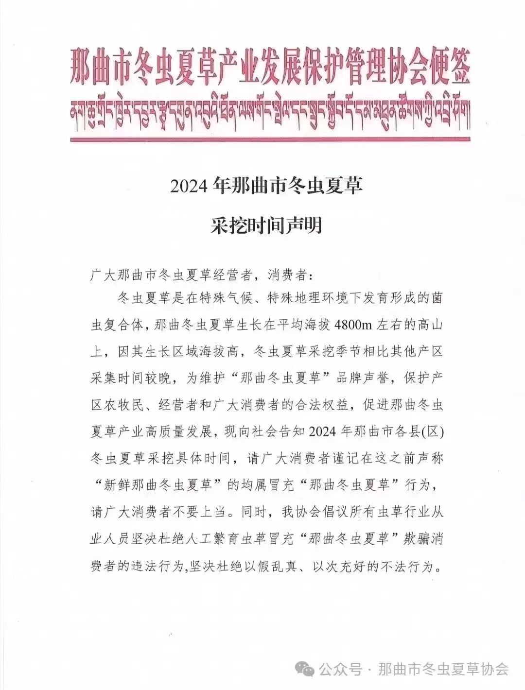冬蟲夏草是在特殊氣候、特殊地理環境下發育形成的菌蟲復合體,那曲冬蟲夏草生長在平均海拔4800m左右的高山上,因其生長區域海拔高,冬蟲夏草采挖季節相比其他產區采集時間較晚,為維護“那曲冬蟲夏草”品牌聲譽,保護產區農牧民、經營者和廣大消費者的合法權益,促進那曲冬蟲夏草產業高質量發展,現向社會告知2024年那曲市各縣(區)冬蟲夏草采挖具體時間,請廣大消費者謹記在這之前聲稱“新鮮那曲冬蟲夏草”的均屬冒充“那曲冬蟲夏草”行為,請廣大消費者不要上當。同時,我協會倡議所有蟲草行業從業人員堅決杜絕人工繁育蟲草冒充“那曲冬蟲夏草”欺騙消費者的違法行為,堅決杜絕以假亂真、以次充好的不法行為。