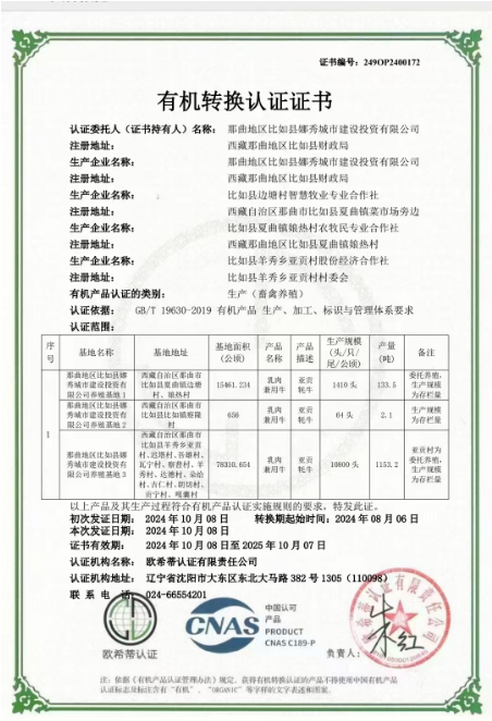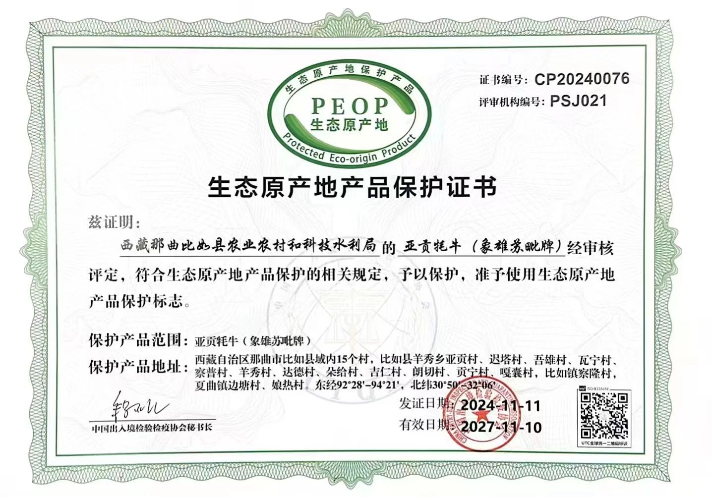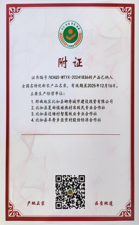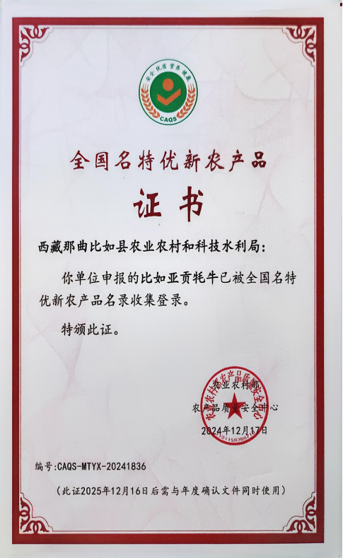 近年來,比如縣委、縣政府始終堅持穩糧、興牧、強特色,圍繞鄉村振興戰略,以調整畜禽結構為主線,以發展規模化養殖為抓手,以實現品牌增值為突破口,將“亞貢牦牛”品牌建設作為推動畜牧業轉型升級的核心引擎,著力做好本土優質種源的開發與保護,全面推進畜牧業高質量發展。功夫不負有心人,“比如亞貢牦牛”現已成功獲得國家生態原產地產品保護標志,順利取得有機轉換認證證書,并榮耀入選“全國名特優新農產品”名錄。這些榮譽不僅是對比如縣畜牧業發展成果的高度認可,更是其邁向更廣闊市場的有力“通行證”。
